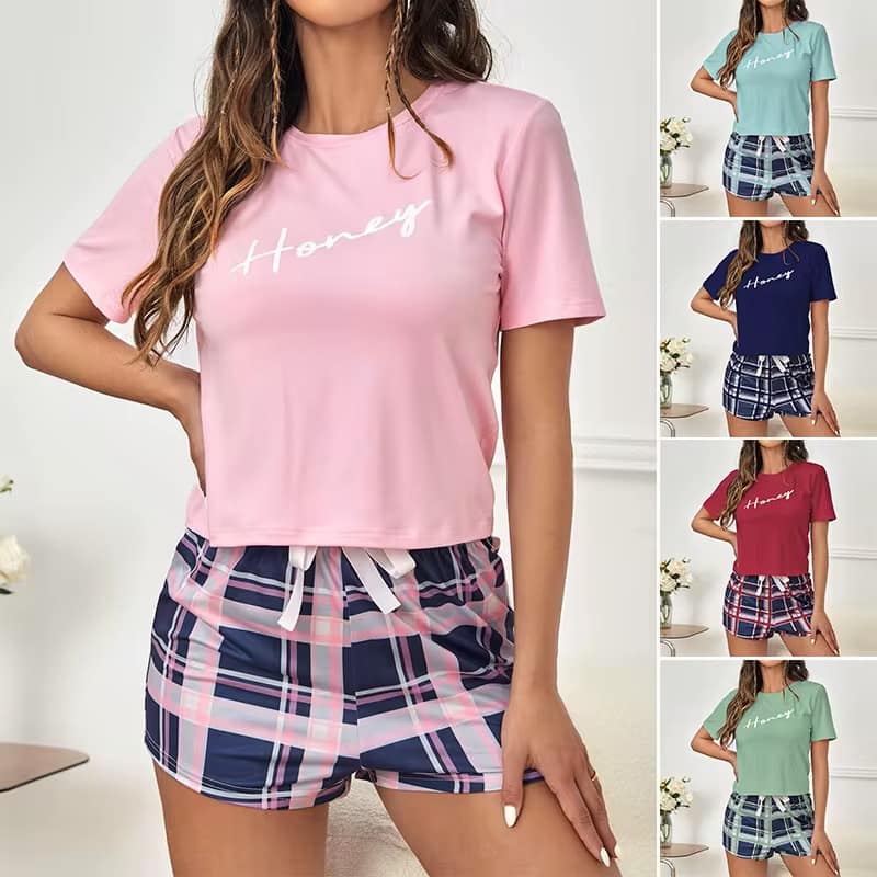 “Honey” Plaid Pajama Set – Comfortable T-shirt & Shorts