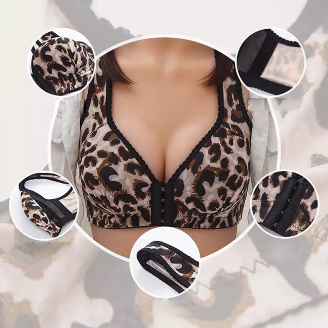 Struggling to wrap your hands around your back while peering over your shoulder into the mirror as you attempt to undo the snag in the clasp in the back is not ideal. Is a little support and functionality too much to ask for? Here is our Leopard Front Open Bra.