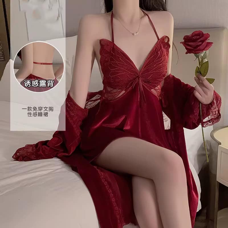 The inner nighty features a vibrant butterfly-inspired bodice with intricate lace-work that provides a natural, flattering lift. Wrapped in the matching sheer mesh robe, you’ll enjoy a dramatic, flowing silhouette finished with delicate lace cuffs—keeping you cool, comfortable, and feeling your most beautiful all night long.