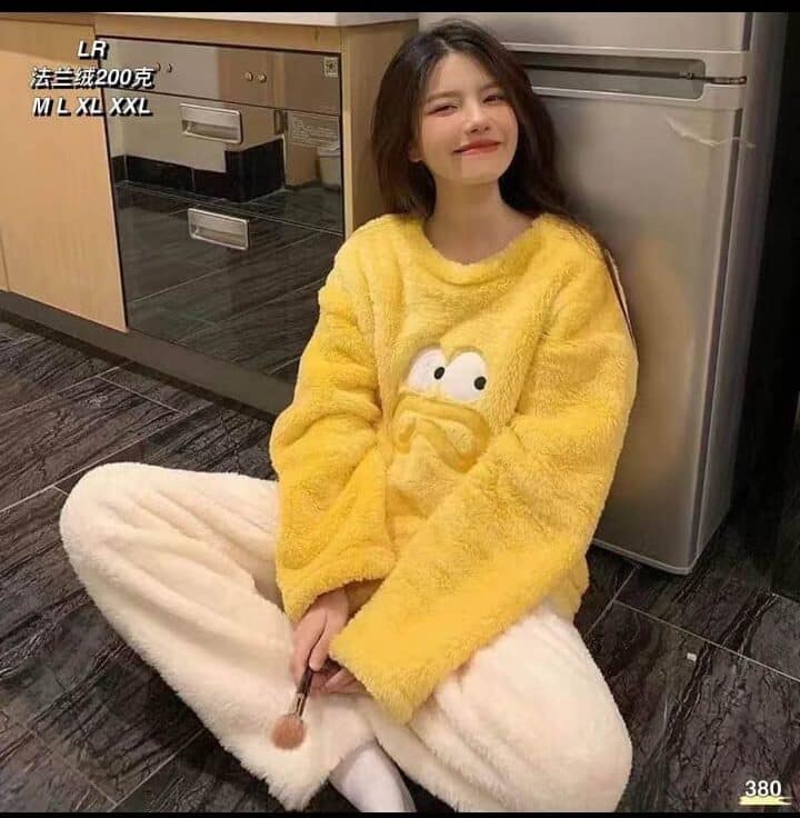 Embrace the cold in the playful MSK Yellow and White Woolen Night Dress. This unique, fun two-piece set is crafted from a thick, shaggy, faux-wool fleece that provides exceptional warmth and a super soft-on-skin feel. The pullover top is a cheerful yellow and features a whimsical cartoon eye and mouth pocket on the front. Paired with soft, contrasting cream-white trousers, this set is designed for maximum coziness and personality during the coldest months.