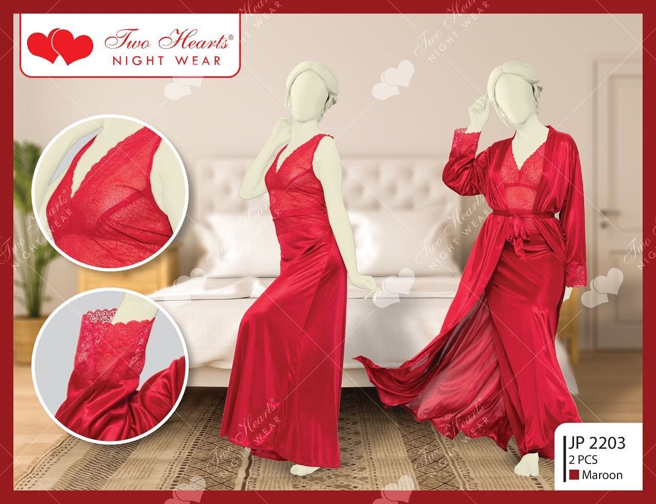 Two hearts Satin Silk Full Night Robe with Inner Nighty